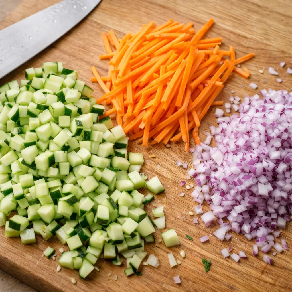 While the pasta cooks, you can prepare your vegetables. First, finely dice the cucumber, making sure to remove the seeds if they’re particularly large. Next, julienne the carrot into thin strips. Then, mince the onion finely—this ensures a pleasant flavor without overwhelming bites of raw onion.