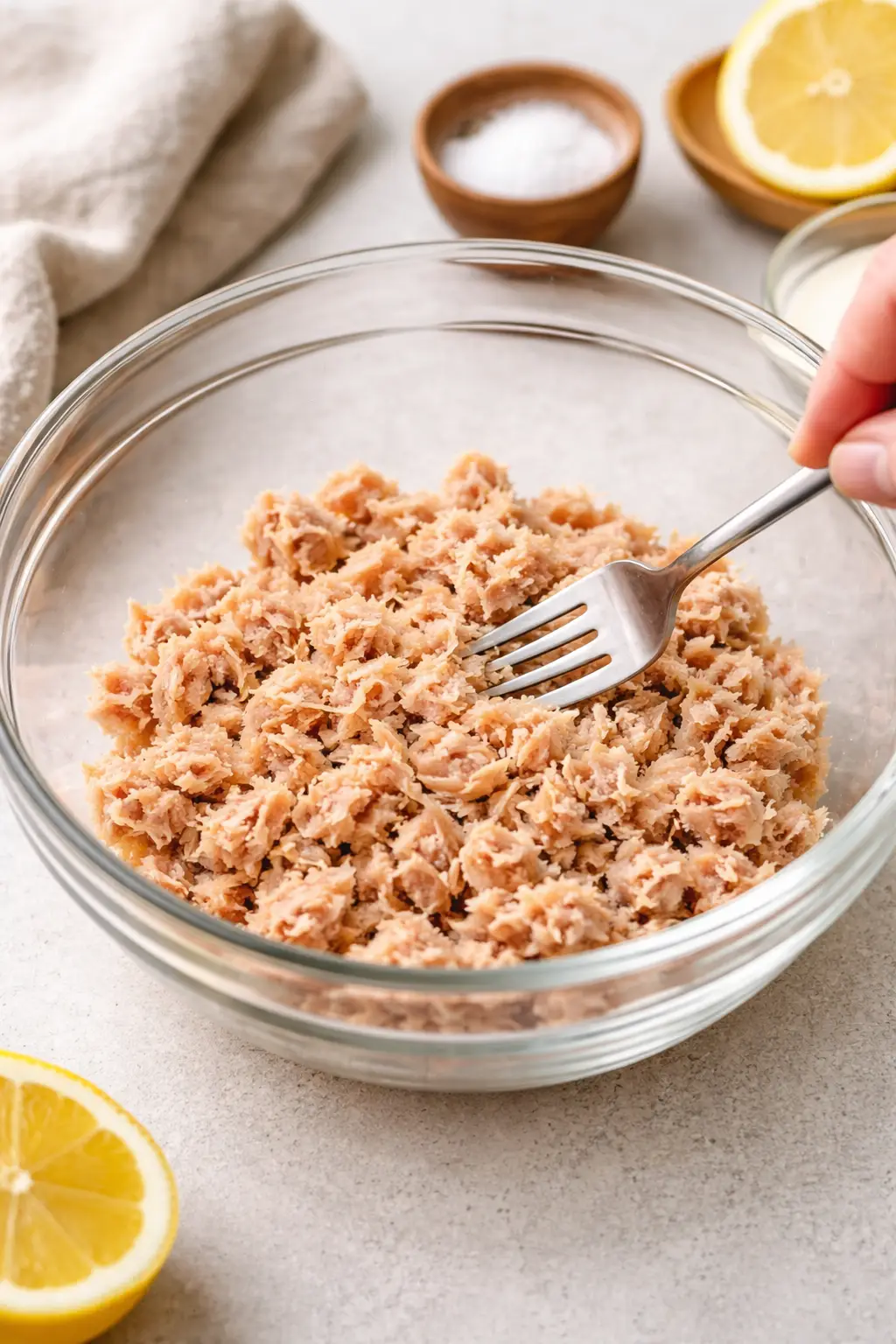 - Use a fork to flake the tuna into small pieces