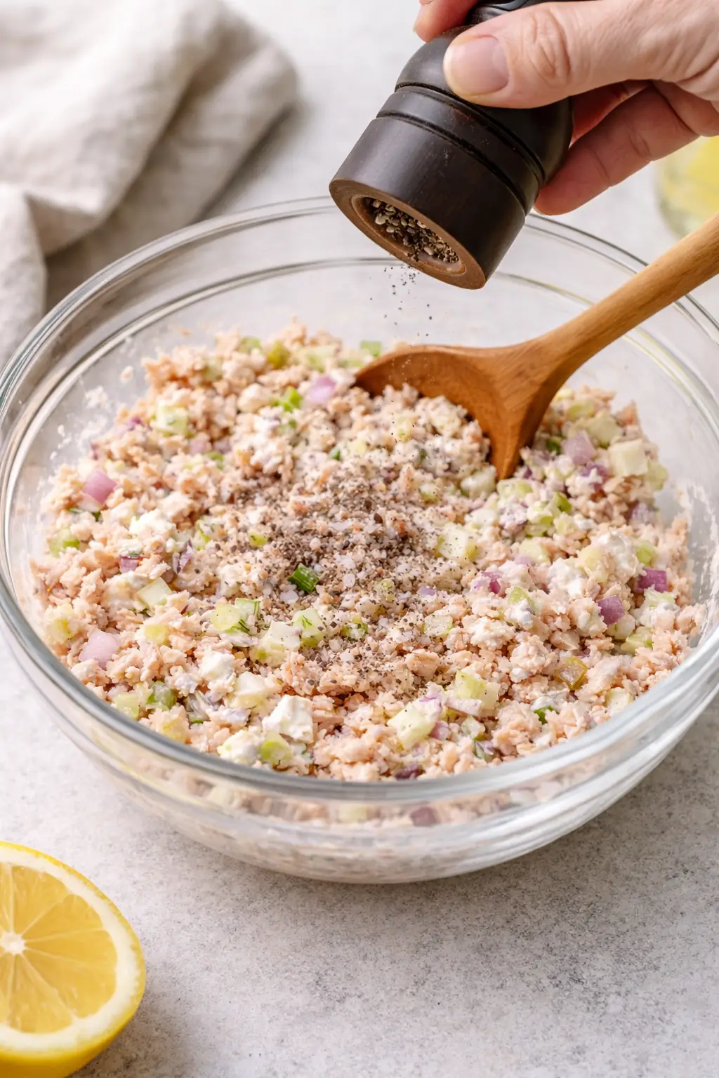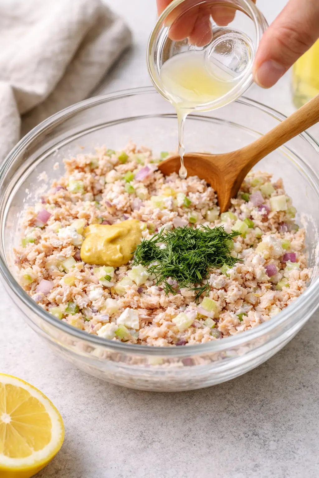- Next, mix in the lemon juice, Dijon mustard, and fresh dill
