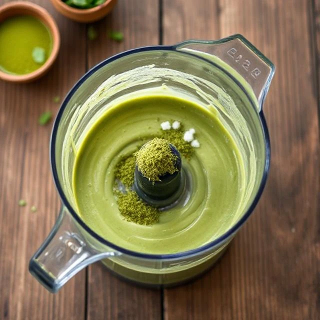 Sprinkle in the matcha powder and pinch of salt. Blend again until the mixture is uniformly green and creamy.