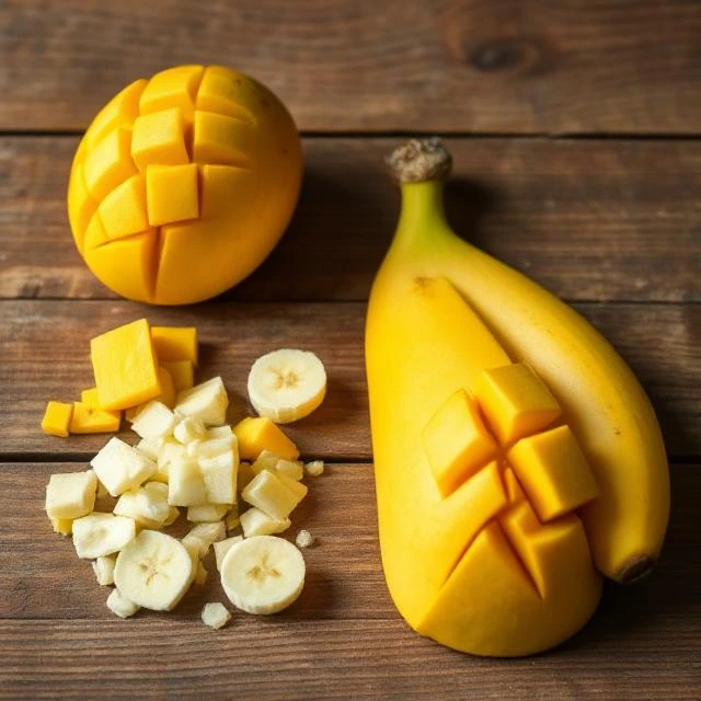 - Prep Ingredients: If you haven’t already, peel and dice the mango, and slice the banana. For best results, use frozen fruit for a thick smoothie.