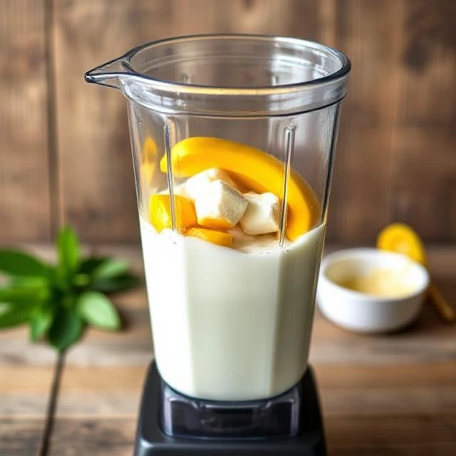 - Blend Base: Add the mango, banana, milk, yogurt, and ice cubes to your high-speed blender. Blend until mostly smooth.