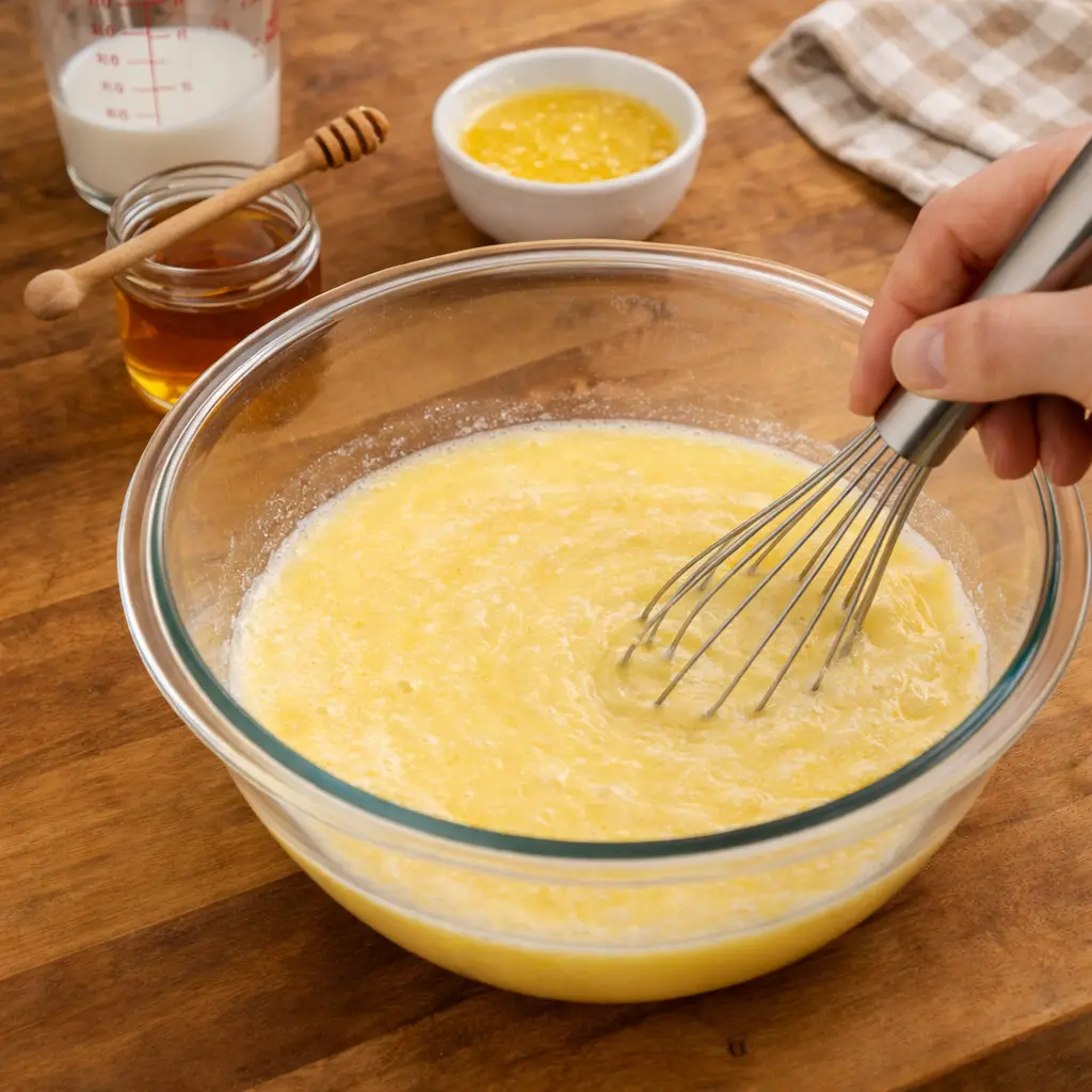 3. Combine Wet Ingredients: In a separate bowl, beat the eggs slightly. Next, add buttermilk, melted butter, and honey, then stir until everything is mixed thoroughly.