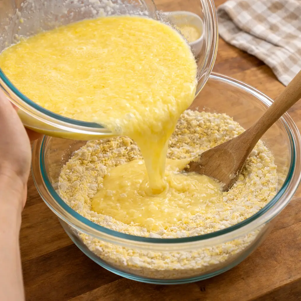 Pour the wet mixture into the dry ingredients. Stir just until combined — avoid overmixing.