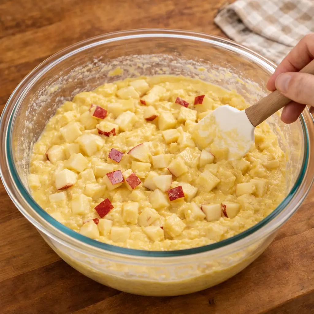 Gently fold in the diced apples using a spatula until evenly distributed throughout the batter.