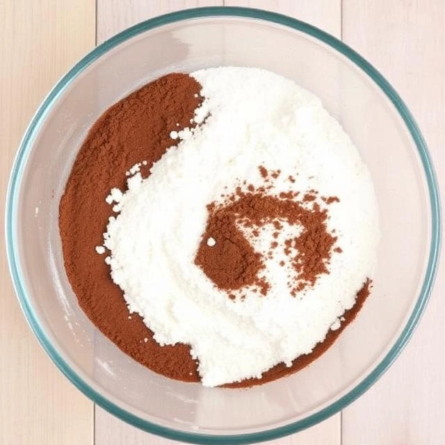 - In a large bowl, sift together flour, cocoa powder, baking powder, and salt.