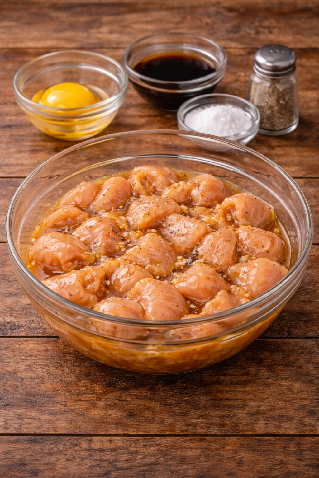 In a bowl, mix 1 lb of chicken breast cut into bite-sized pieces with 1 egg, 1 tsp soy sauce, 1/2 tsp salt, and 1/4 tsp pepper. Let it marinate for 30 minutes.
