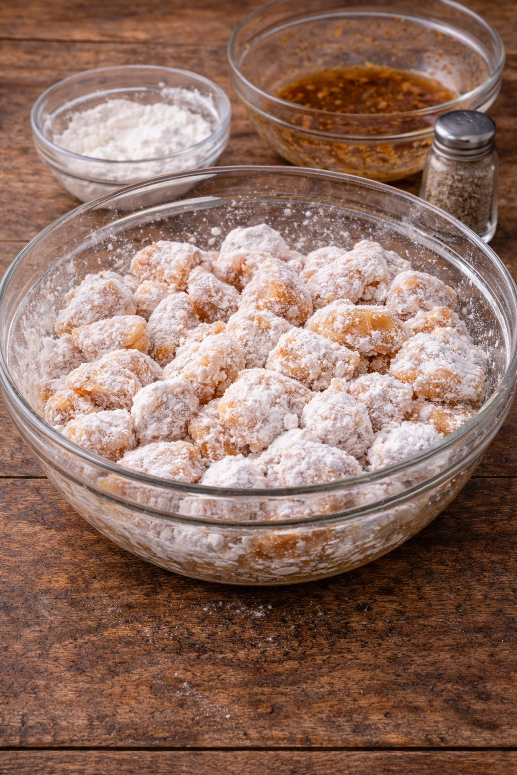 Coat the marinated chicken with 1/2 cup cornstarch until each piece is evenly coated.
