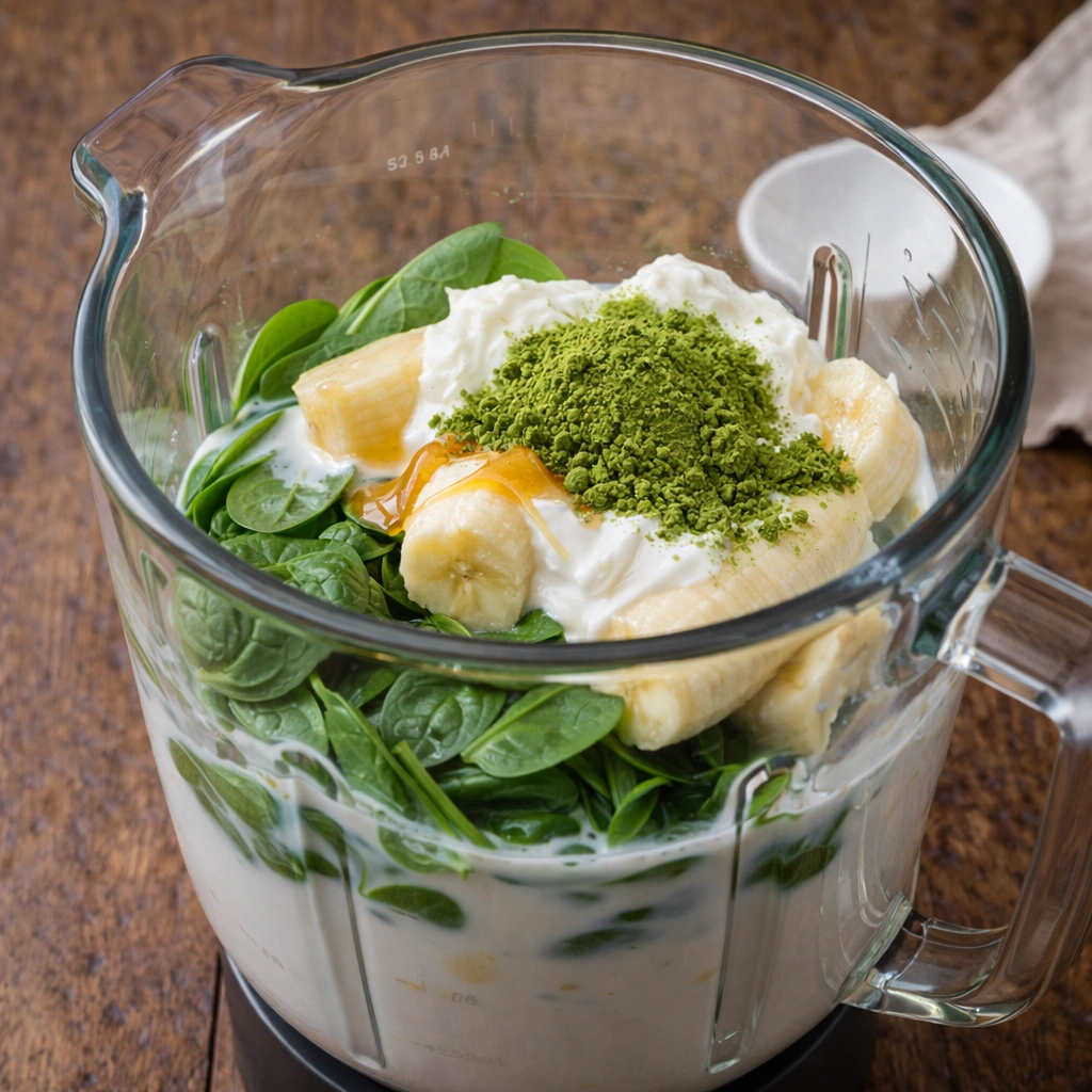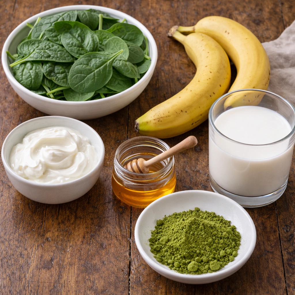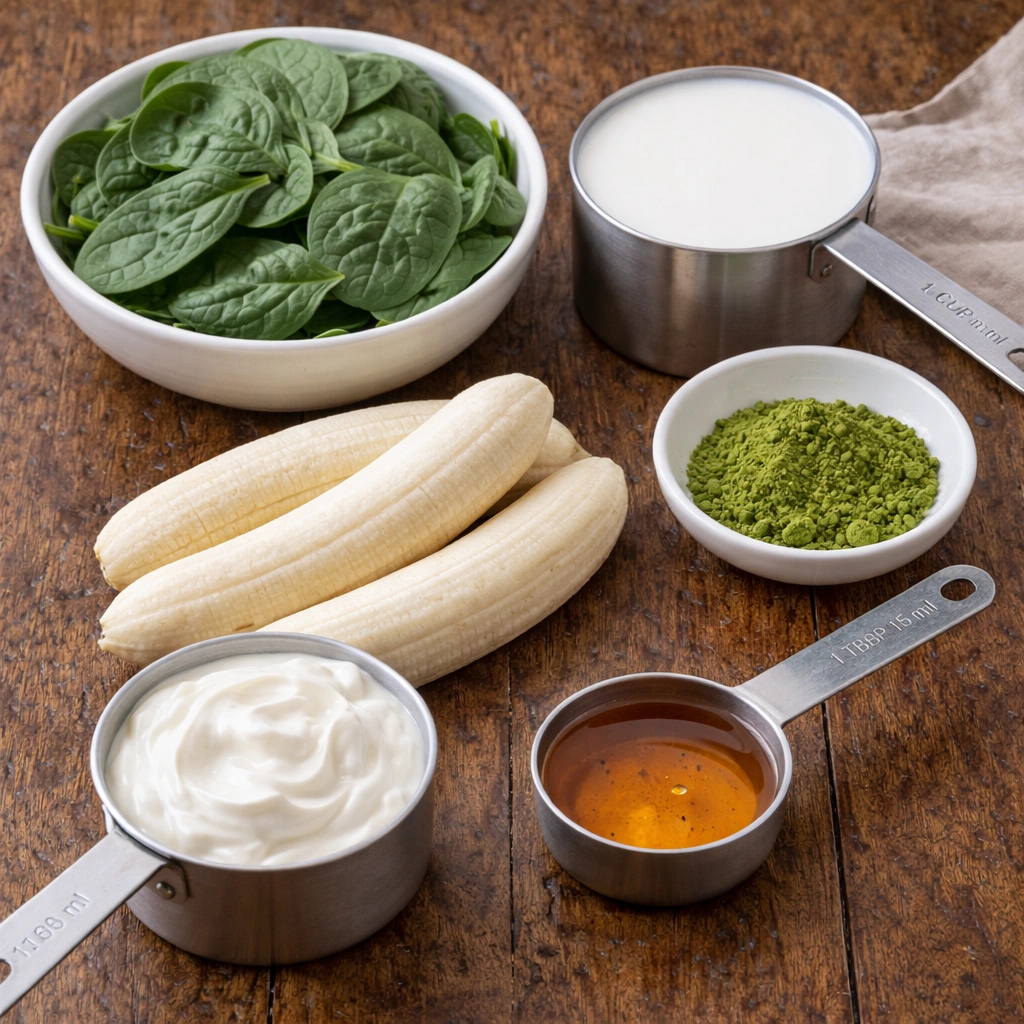 Collect fresh spinach, ripe bananas, creamy Greek yogurt, honey, almond milk, and high-quality matcha powder.Prep the Ingredients