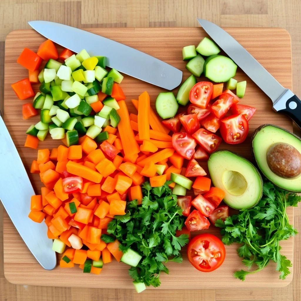 Dice bell peppers, carrot, cucumber, and cabbage. Halve tomatoes, slice avocado, and chop parsley.