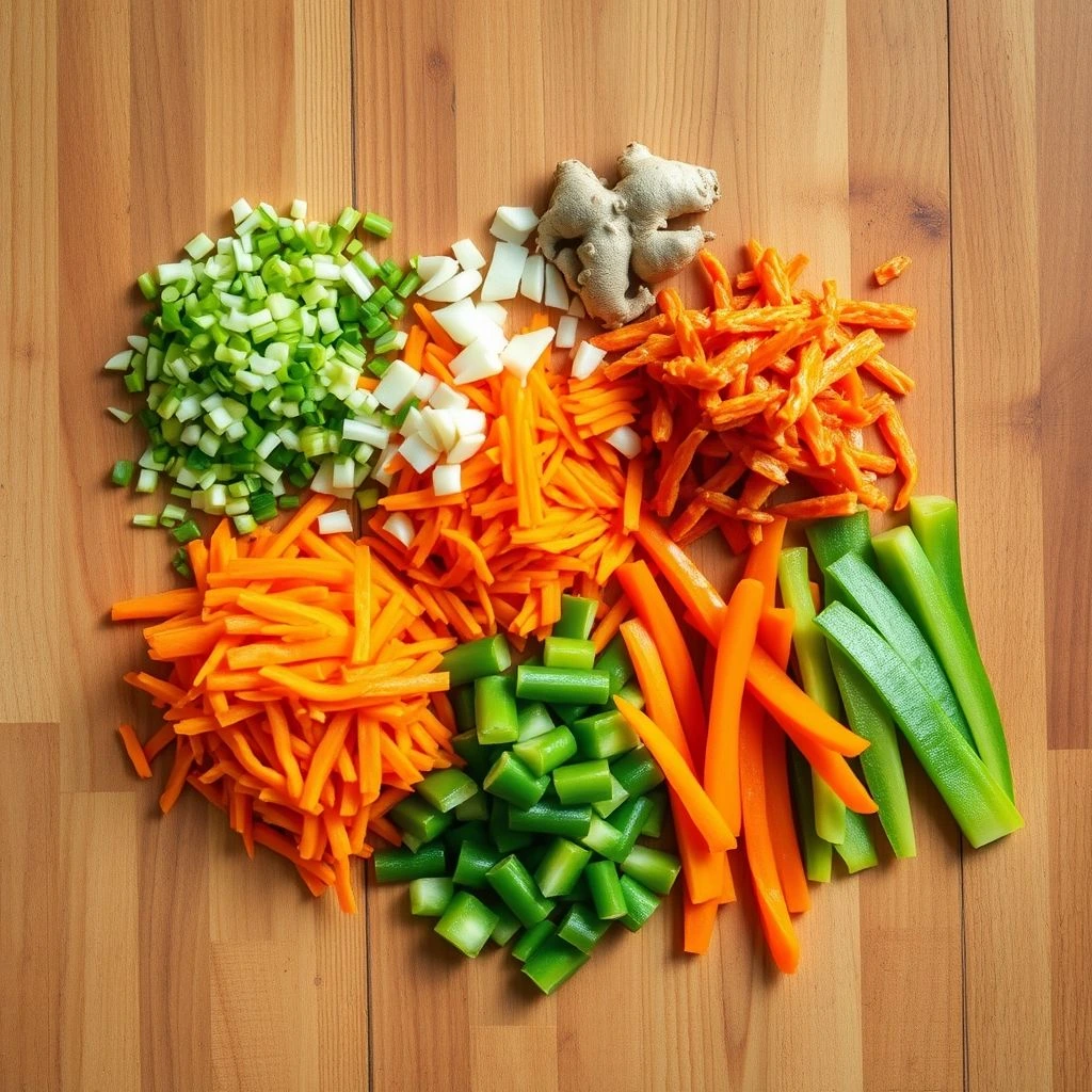 - Dice the green onions and garlic. Grate the ginger and carrots. Chop kimchi and slice bell pepper. Having everything ready speeds things up!