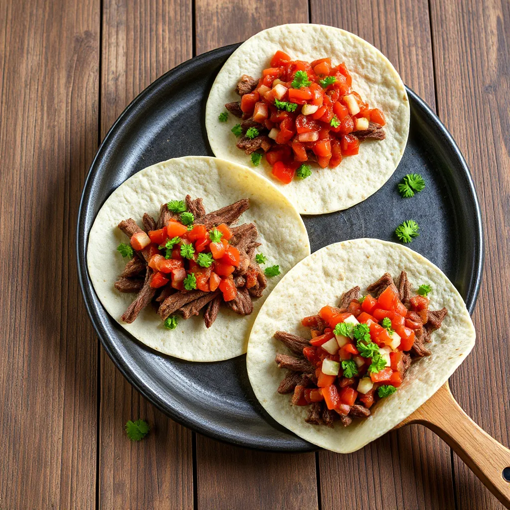 Fill tortillas with sliced beef, pile on the salsa, and finish with your choice of toppings.