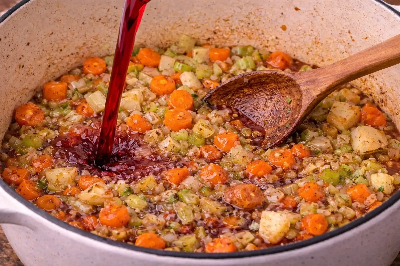 Pour in red wine to deglaze, scraping up any browned bits from the bottom.Combine Ingredients