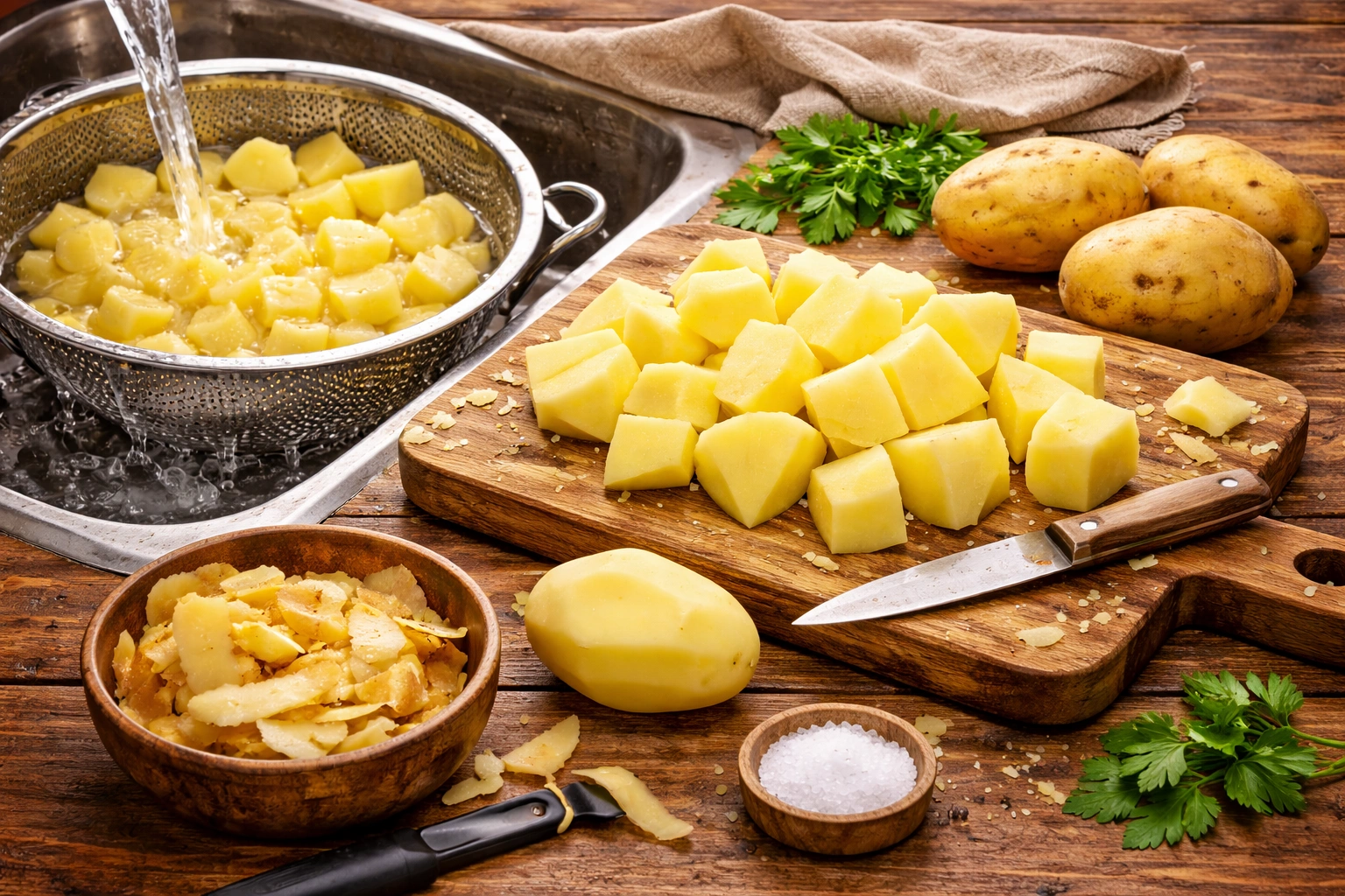 Peel and chop 2 pounds of potatoes into small, evenly sized pieces. Rinse them thoroughly under cold water to remove excess starch.Using Yukon Gold or Russet potatoes works best for that creamy texture.Boiling the Potatoes
