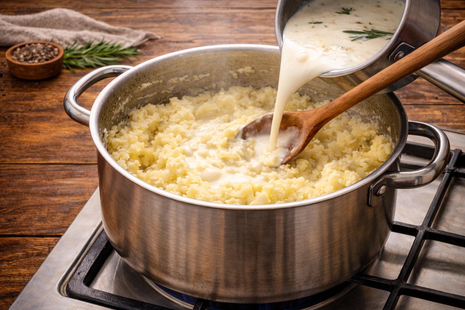 In a small saucepan, heat 1 cup of heavy cream over low heat until warm. You can also add a couple of garlic cloves or a sprig of rosemary for extra flavor.Infusing the cream with aromatics will elevate the taste of the mashed potatoes.Mashing the Potatoes
