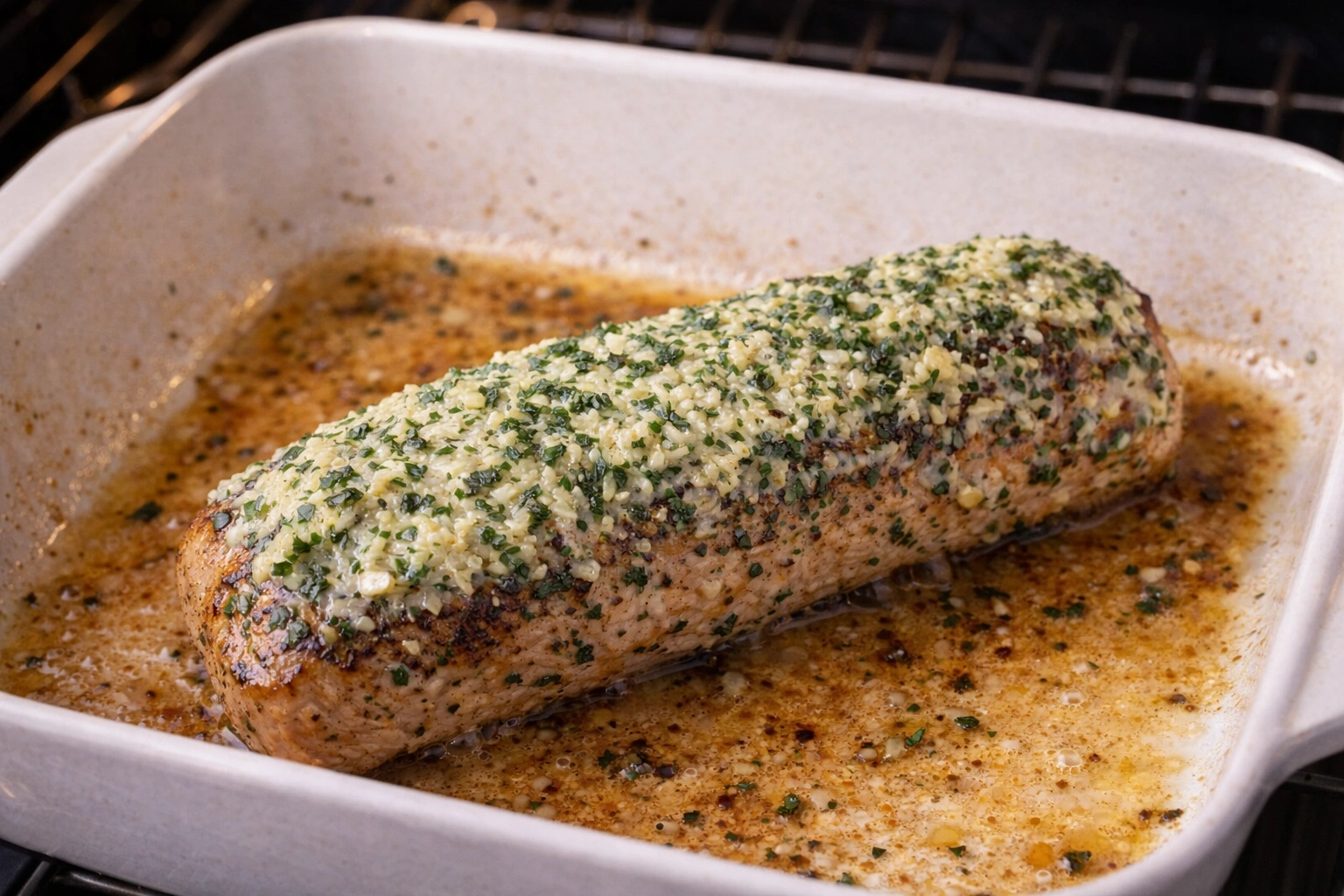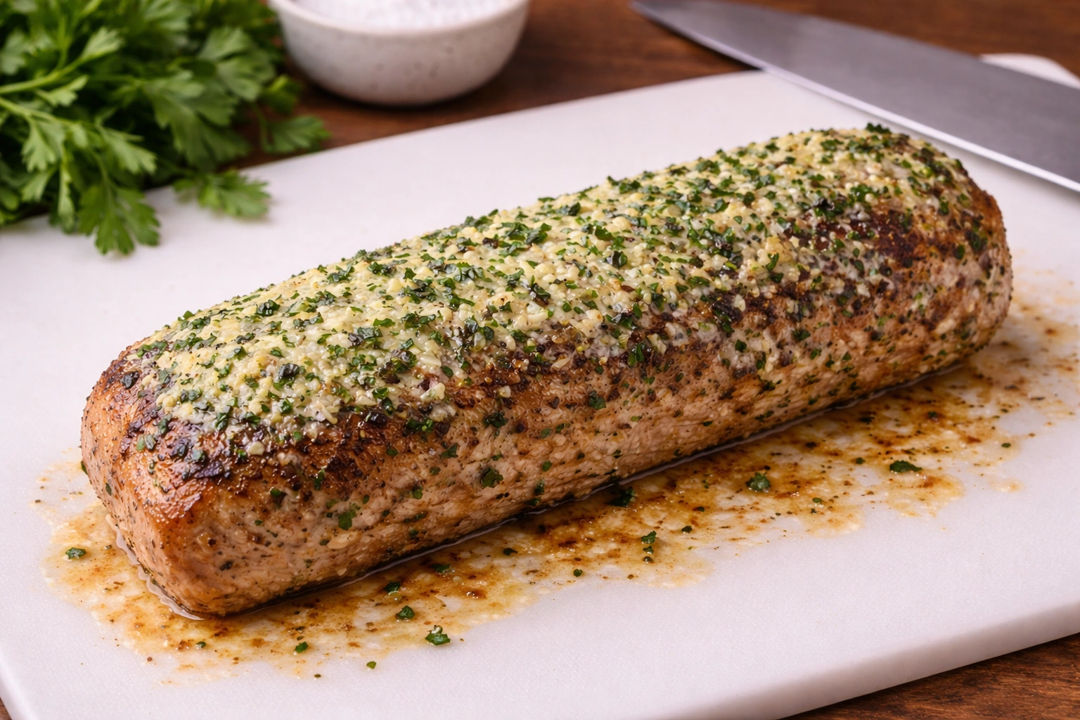 Preheat the oven to 375°F (190°C). Pat dry the pork tenderloin with paper towels. Season it generously with salt and pepper on all sides.Allow the pork to sit at room temperature for about 20 minutes to ensure even cooking.Prepare the Garlic Butter Mixture