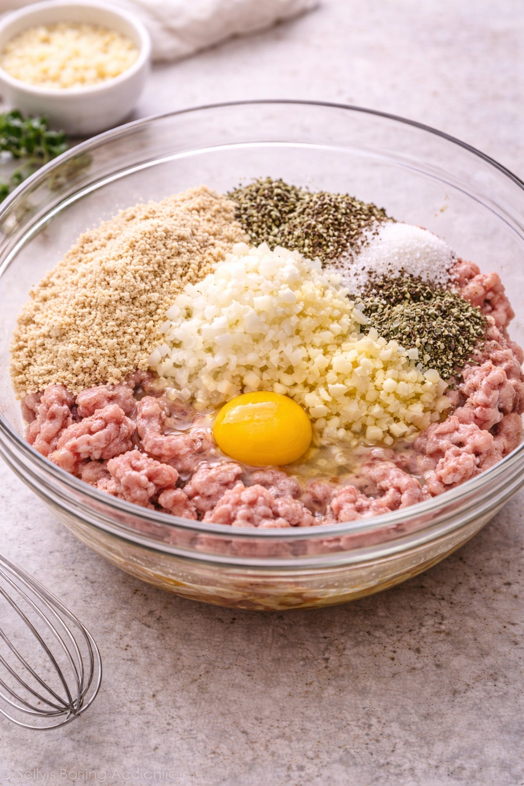 In a large bowl, combine ground pork, breadcrumbs, minced garlic, finely chopped onion, grated Parmesan cheese, beaten egg, salt, pepper, and a sprinkle of dried oregano.Mix until well combined, but avoid overworking the mixture to keep the meatballs tender.Shape the Meatballs