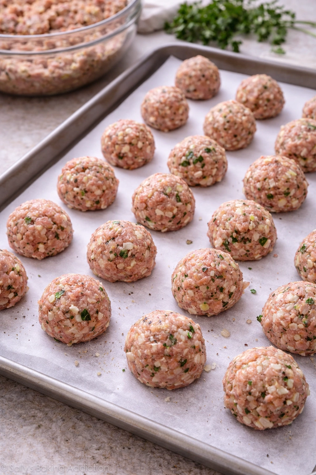 Take small portions of the mixture and roll them into meatballs about the size of a golf ball. Place them on a baking sheet lined with parchment paper.Ensure all meatballs are evenly sized for consistent cooking.
