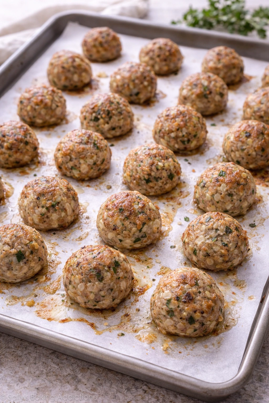 Once cooked, remove the meatballs from the oven. Garnish with fresh chopped parsley and a sprinkle of grated Parmesan cheese. Serve hot with your favorite sauce or pasta.These meatballs are delicious on their own or served with marinara sauce over spaghetti.
