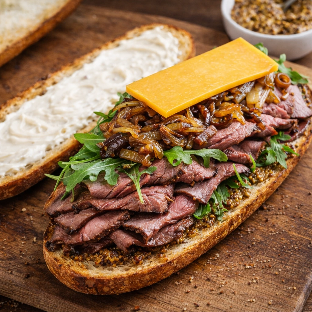 Pile the sliced roast beef generously on the bread. Top with arugula, caramelized onions, and a slice of sharp cheddar.The layers create a symphony of flavors and textures.Finish and Serve