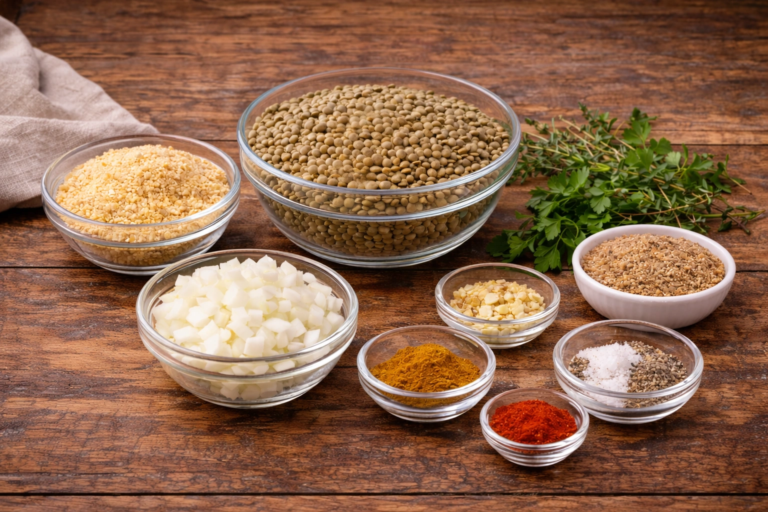 Start by gathering all your ingredients: lentils, breadcrumbs, onions, garlic, flaxseed, herbs, and spices. Make sure everything is measured and ready to go.