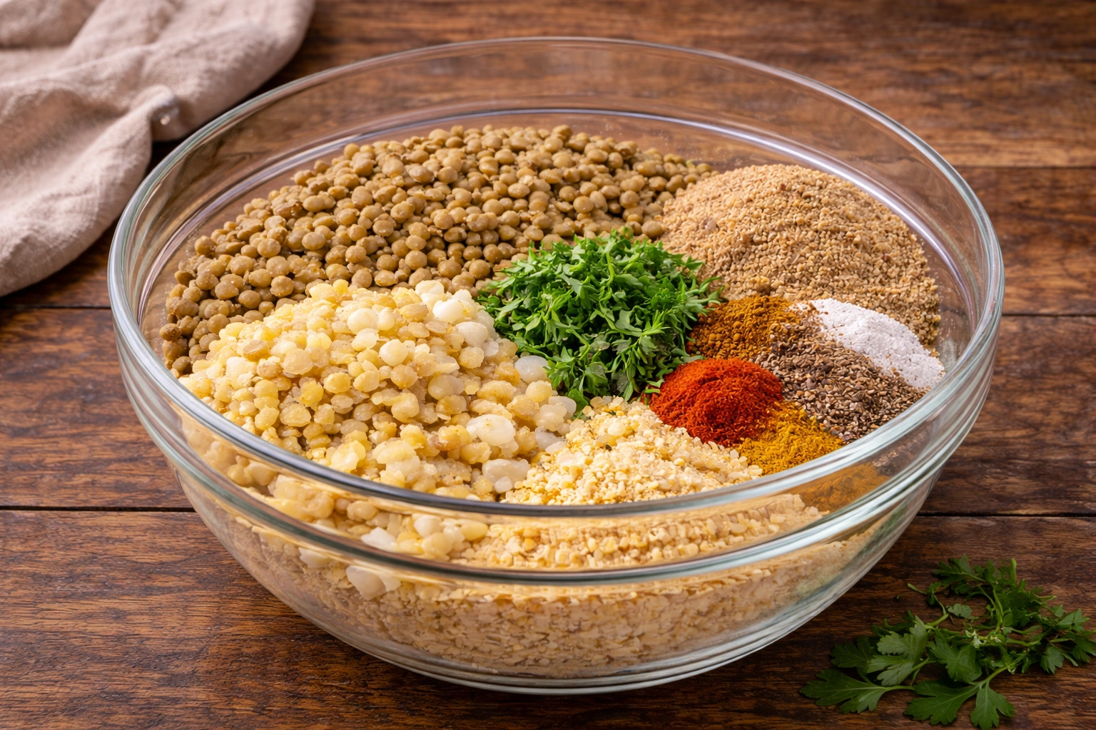 In a large bowl, combine the cooked lentils, sautéed onions, garlic, breadcrumbs, flaxseed mixture, and your choice of herbs and spices.