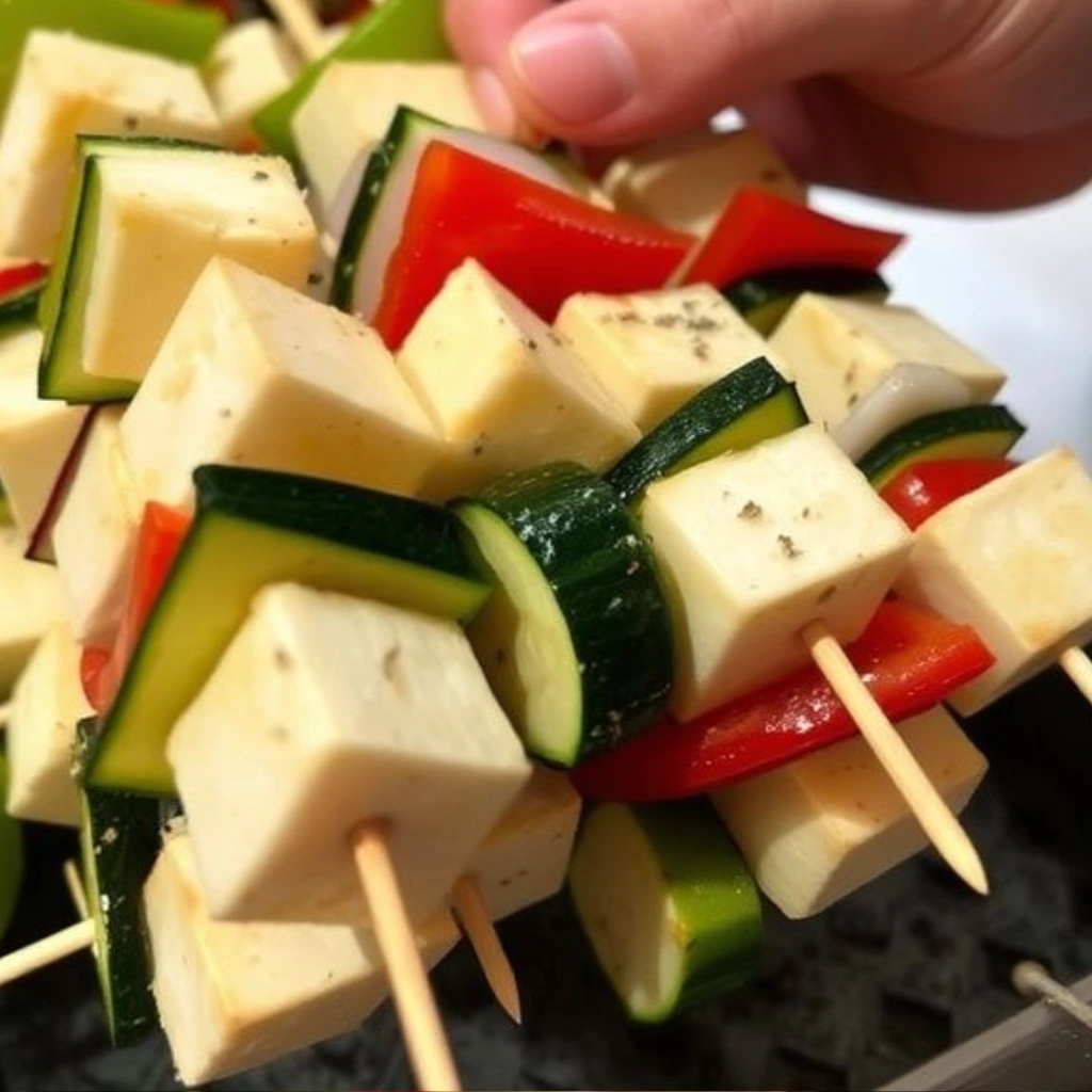 After marinating, thread the tofu pieces onto soaked wooden skewers, alternating with bell peppers, onion, and zucchini.