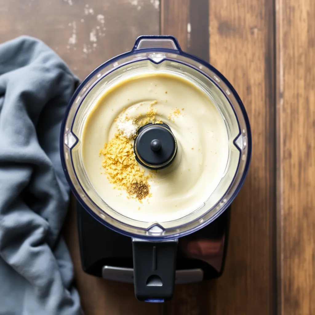 1. Make Cashew Cream: Blend soaked cashews, water, lemon juice, garlic, nutritional yeast, salt, and pepper until completely smooth, scraping down the sides as needed. Add more water if you want it thinner. Taste and adjust seasoning.